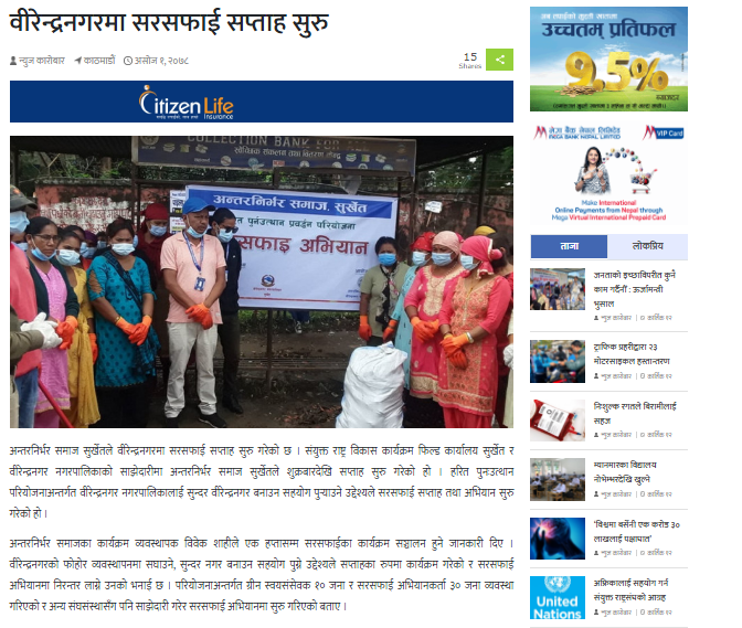 अन्तरनिर्भर समाज सुर्खेतले वीरेन्द्रनगरमा सरसफाई सप्ताह सुरु गरेको छ । संयुक्त राष्ट्र विकास कार्यक्रम फिल्ड कार्यालय सुर्खेत र वीरेन्द्रनगर नगरपालिकाको साझेदारीमा अन्तरनिर्भर समाज सुर्खेतले शुक्रबारदेखि सप्ताह सुरु गरेको हो । हरित पुनःउत्थान परियोजनाअन्तर्गत वीरेन्द्रनगर नगरपालिकालाई सुन्दर वीरेन्द्रनगर बनाउन सहयोग पुर्याउने उद्देश्यले सरसफाई सप्ताह तथा अभियान सुरु गरेको हो ।