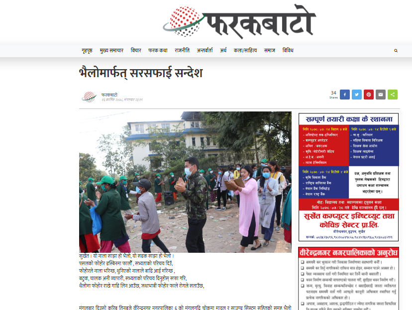 मंगलबार दिउसो करिब तिनबजे वीरेन्द्रनगर नगरपालिका ६ को मंगलगढि चोकमा मादल र साउण्ड सिस्टम सहितको समुह भैलो खेल्दै थियो । हरिया पोशाकमा सडकमा भैलो खेल्न आएका अरु कोहि नभई अन्तरनिर्भर समाज सुर्खेतका सरसफाई स्वयम्सेवक थिए ।